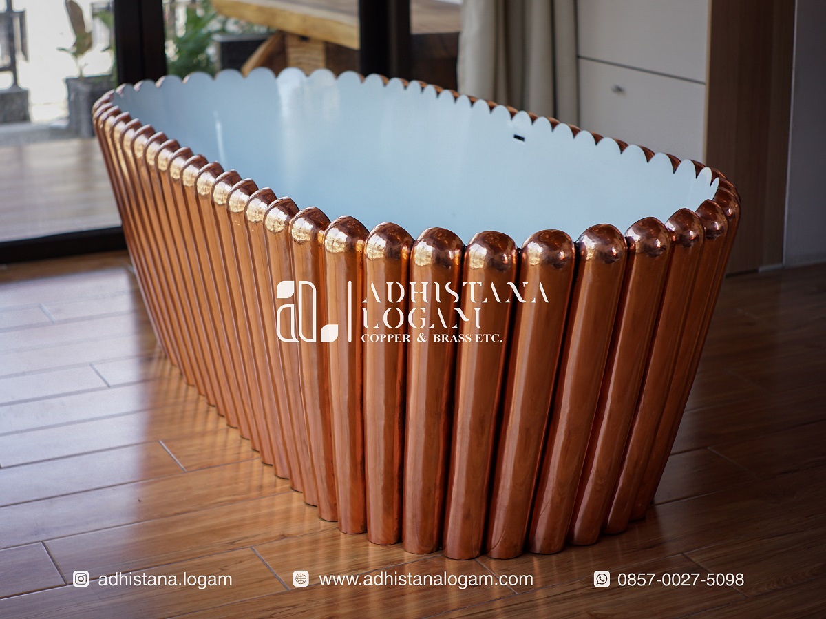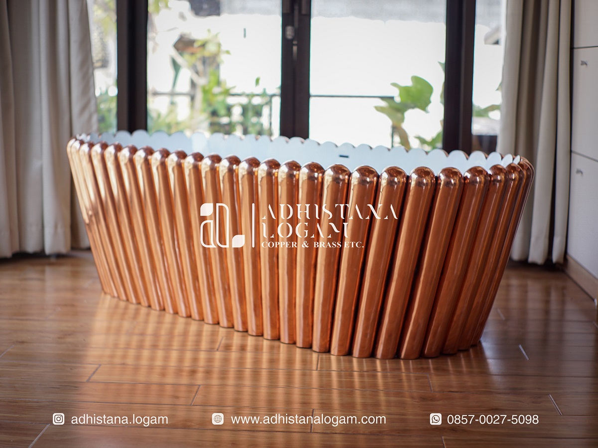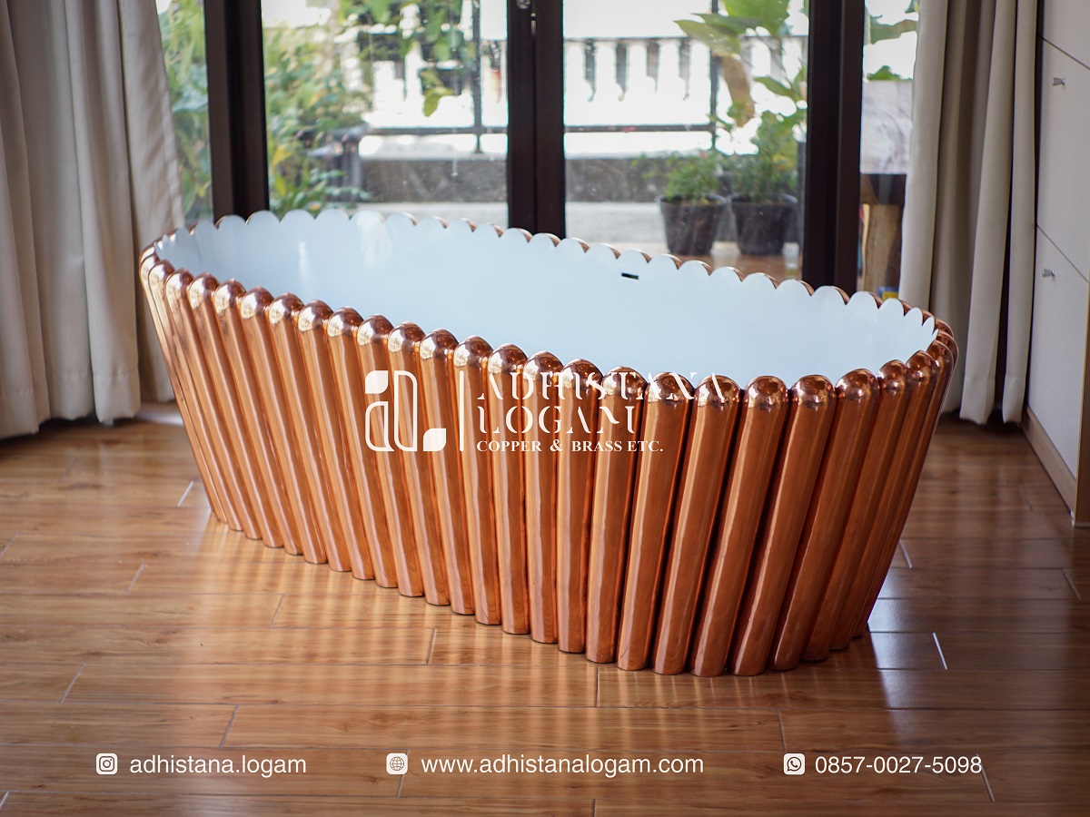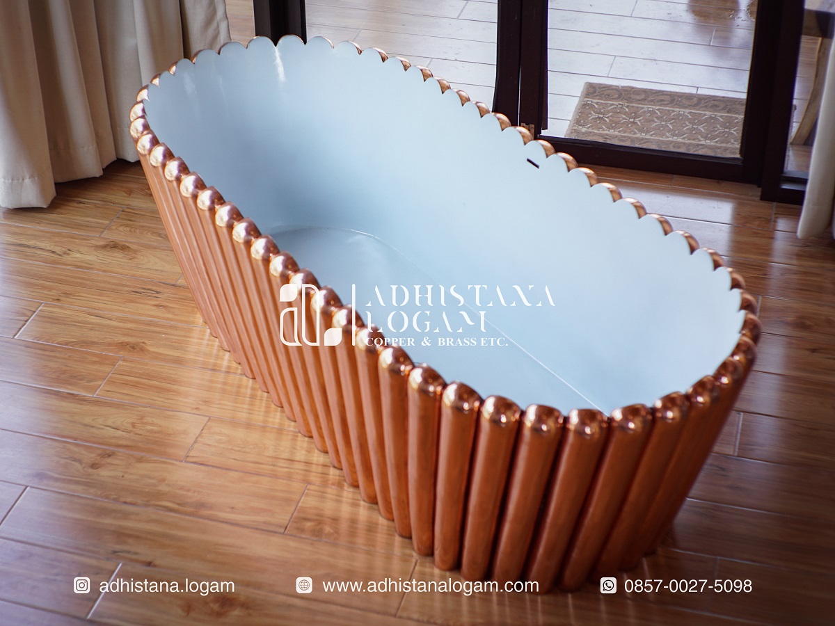 Bathtub atau Bak mandi Tembaga adalah salah satu produk unggulan Adhistana Logam, sejak 2019 kami rutin ekspor bathtub ke jerman dan kanada, peminat bathtub tembaga mayoritas berasal dari manca negara salah satunya ini adalah orderan customer dari Jerman, dengan bentuk yang unik ini merupakan custom desain langsung dari klien, dengan model double wall bagian dalam dengan tekstur halus dengan warna biru muda sedangkan bagian luar berbentuk seperti gelombang dengan menyusun panel lengkungan menyesuaikan bentuk bak mandi dengan lebar sama yang menjadikan ini sangat presisi, dengan warna luar rosegold glossy tampilan bak mandi ini terlihat sangat mewah. Sudah banyak bathtub yang kami produksi silahkan cek di artikel kami yang lainya, bisa pilih sesuai selera atau kebutuhan dan kami juga melayani custom desain sesuai permintaan customer. Selain digunakan secara pribadi bathtub seperti ini sering digunakan di hotel, resort atau villa di daerah Bali atau kota besar lainya. Tak hanya memiliki kelebihan dari segi estetika, Bathtub atau Bak Mandi Tembaga ternyata juga memiliki kelebihan diantaranya high durability, eco friendly & antibacterial.