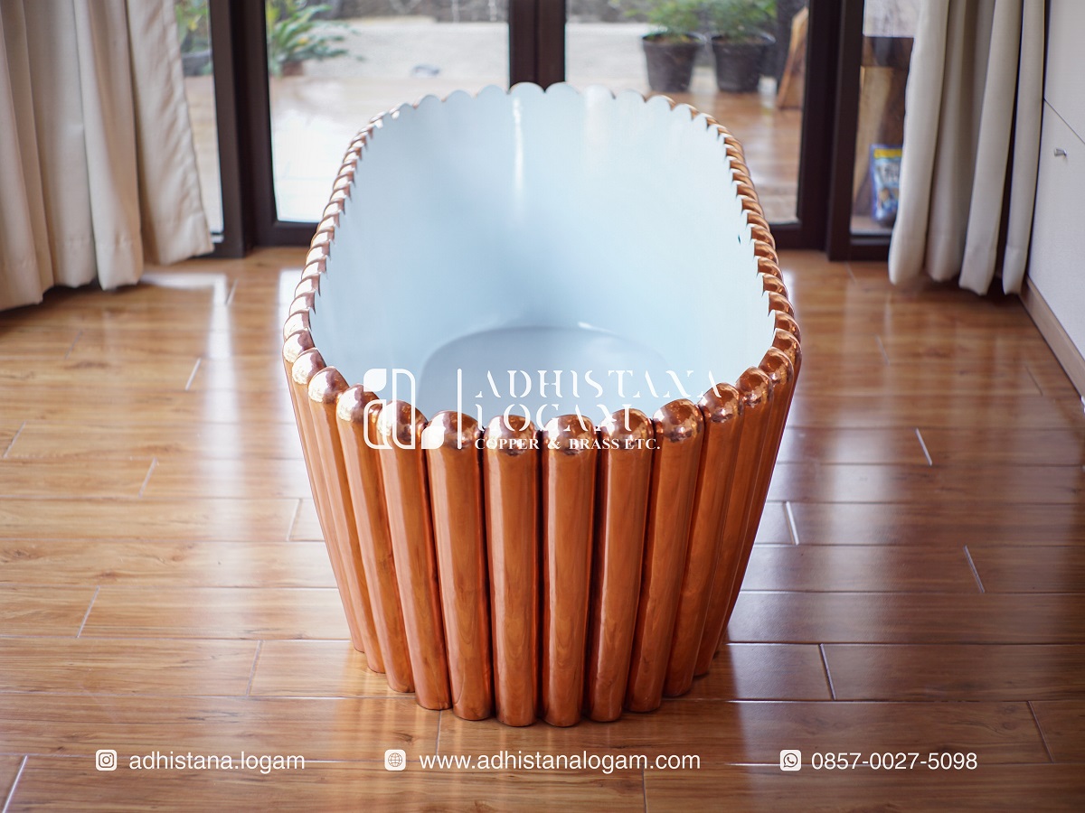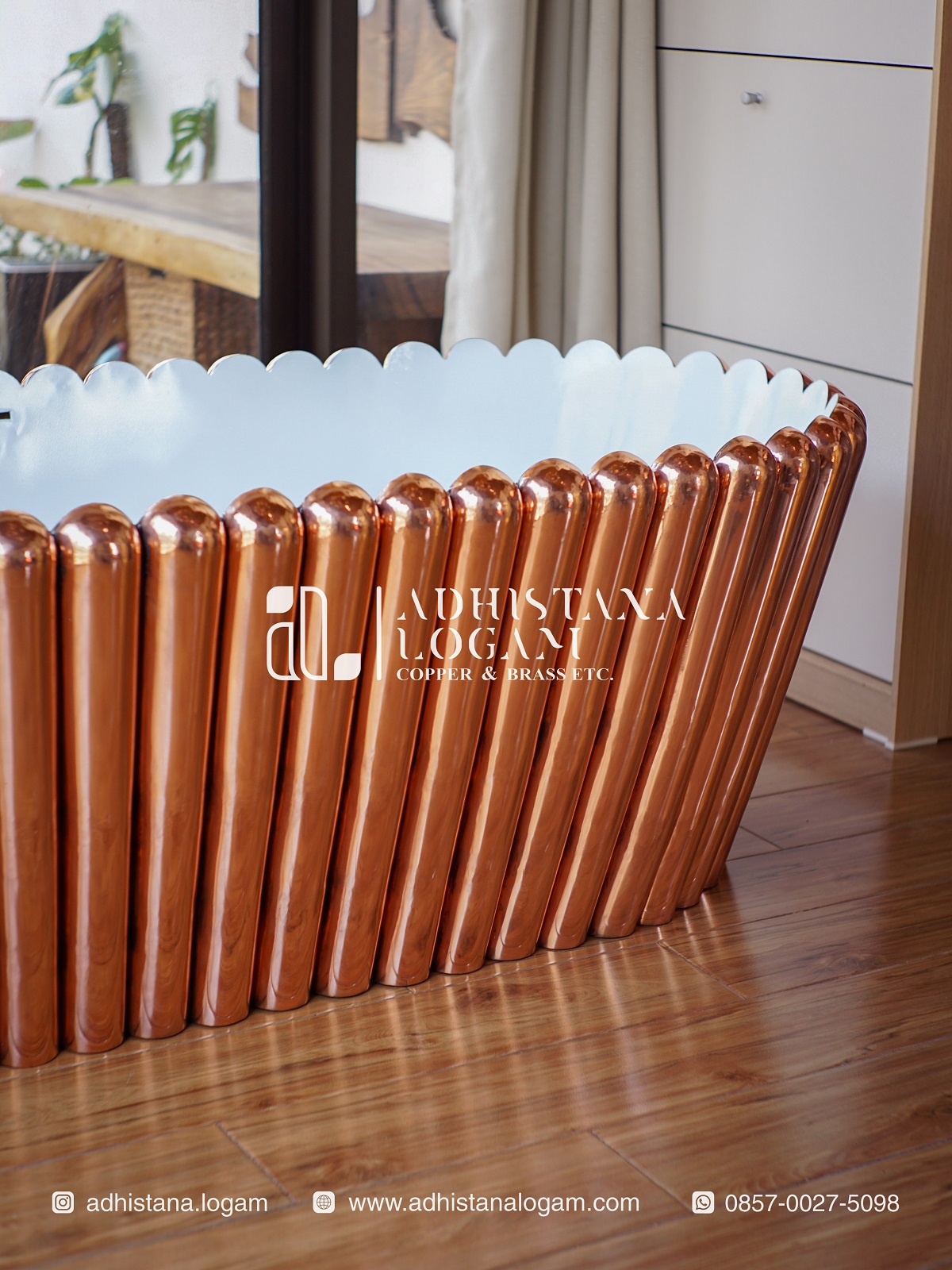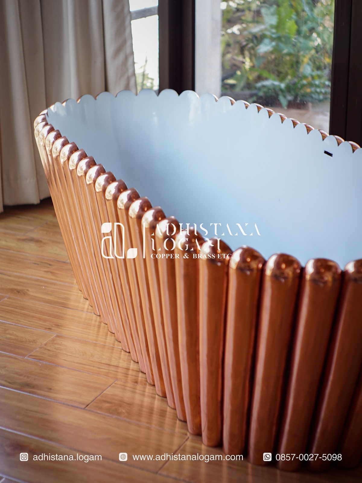 Bathtub atau Bak mandi Tembaga adalah salah satu produk unggulan Adhistana Logam, sejak 2019 kami rutin ekspor bathtub ke jerman dan kanada, peminat bathtub tembaga mayoritas berasal dari manca negara salah satunya ini adalah orderan customer dari Jerman, dengan bentuk yang unik ini merupakan custom desain langsung dari klien, dengan model double wall bagian dalam dengan tekstur halus dengan warna biru muda sedangkan bagian luar berbentuk seperti gelombang dengan menyusun panel lengkungan menyesuaikan bentuk bak mandi dengan lebar sama yang menjadikan ini sangat presisi, dengan warna luar rosegold glossy tampilan bak mandi ini terlihat sangat mewah. Sudah banyak bathtub yang kami produksi silahkan cek di artikel kami yang lainya, bisa pilih sesuai selera atau kebutuhan dan kami juga melayani custom desain sesuai permintaan customer. Selain digunakan secara pribadi bathtub seperti ini sering digunakan di hotel, resort atau villa di daerah Bali atau kota besar lainya. Tak hanya memiliki kelebihan dari segi estetika, Bathtub atau Bak Mandi Tembaga ternyata juga memiliki kelebihan diantaranya high durability, eco friendly & antibacterial.