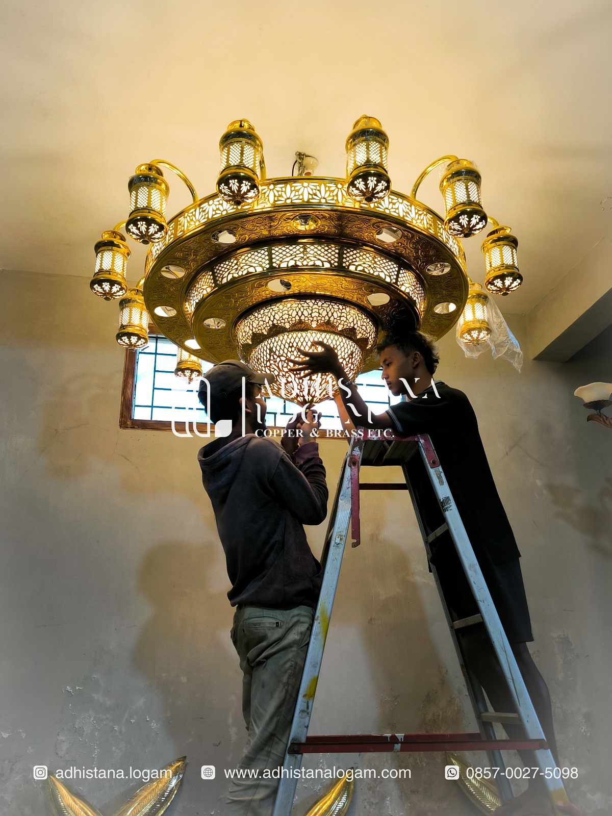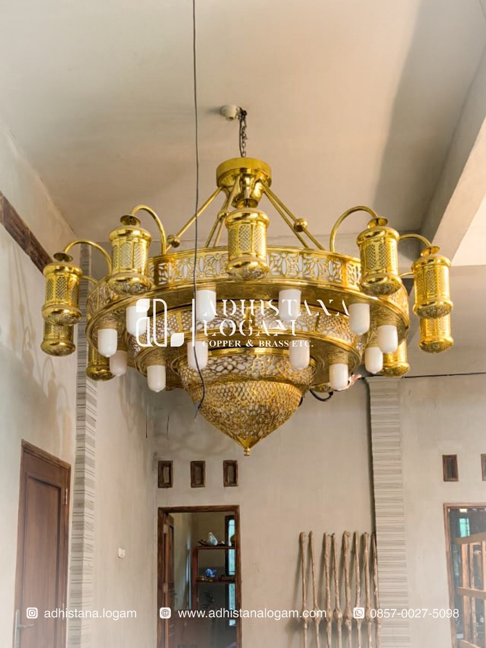 Terbuat dari bahan kuningan dengan warna asli menyerupai emas, lampu ini memberikan kesan mewah di dalam masjid, jika diperhatikan detail pada lampu ini secara keseluruhan bermotif motif khas maroko dengan ukiran tembus yang dilapis dengan akrilik putih sehingga motif terlihat jelas dan cahaya lampu kontras yang indah, kami menawarkan beberapa pilihan motif diantaranya dengan motif ukiran mozaik, kaligrafi atau nama masjid sesuai permintaan customer. Selanjutnya untuk kap lampu ini menggunakan kuningan dengan bentuk tabung dengan motif khas amroko juga dan tentunya dilapis akrilik putih yang berfungsi untuk filter cahaya lampu agar supaya sinar menjadi halus. Adhistana Logam juga memperhatikan pemakaian bohlam berkualitas dan instalasi kabel yang rapi dan aman maka tidak perlu khawatir akan konslet dan bolham cepat rusak,  kami menggunakan bolham phillips yang sudah teruji kualitasnya dan untuk warna ada pilihan warna putih atau warm white sesuai selera dan kami selalu memberikan garansi