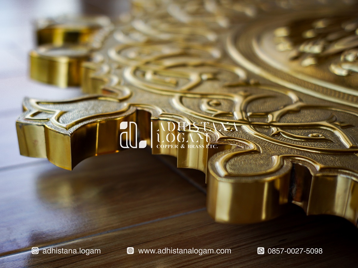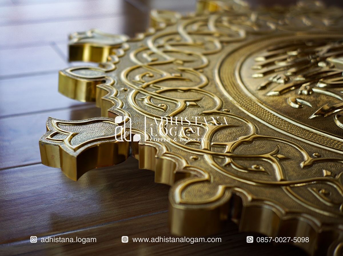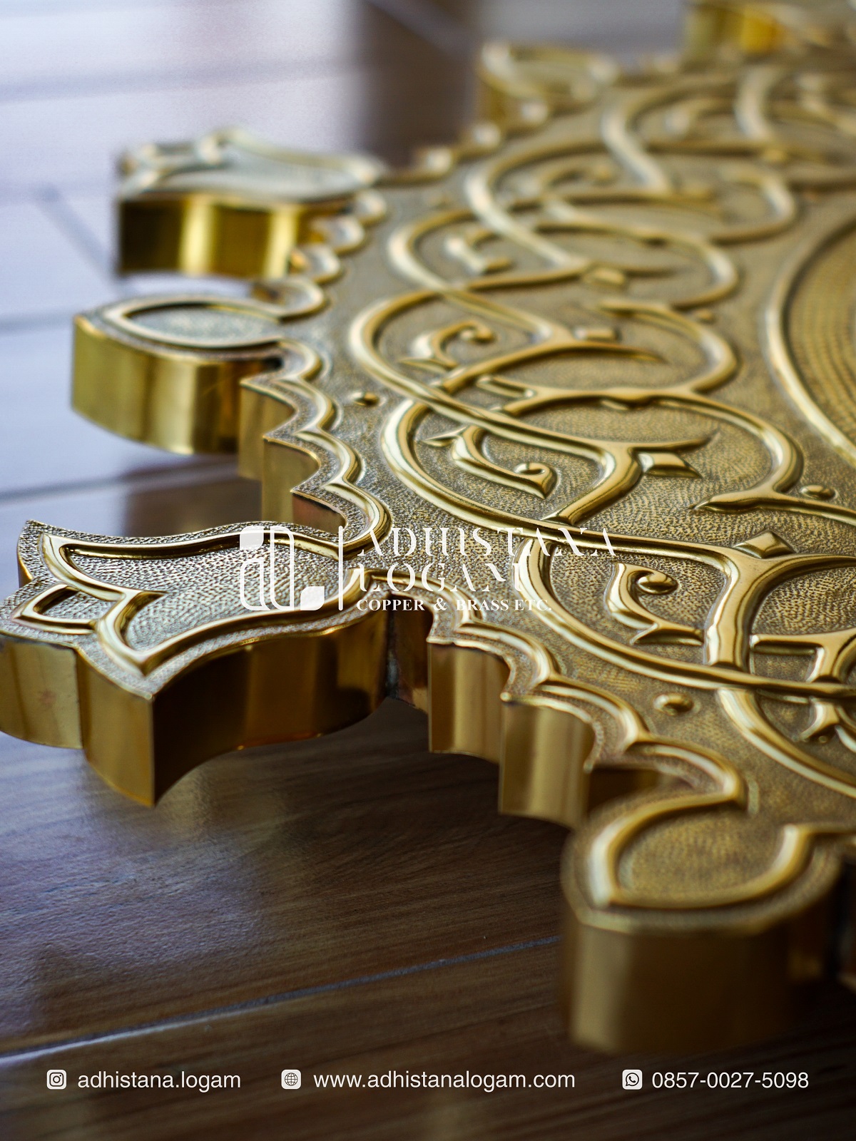 Terbuat dari bahan kuningan dengan warna asli menyerupai emas, ornamen ini memberikan kesan mewah di dalam masjid. jika diperhatikan secara detail motif nya merupakan ukiran timbul dengan bagian tengah kaligrafi dan bagian pinggir pattern islami yang diukir manual oleh tenaga ahli kami, setelah itu penambahan lis ketebalan samping sehingga menjadi kesan tebal atau istilahnya 3 dimensi, step yang terakhir finishing dengan cara dipoles sehingga menghasilkan warna emas mengkilat yang sangat mewah dan agar warna tetap awet maka produk ini dispray coating menggunakan coating yang setara untuk mobil sehingga tahan terhadap cuaca dan tidak mudah oksidasi. Ornamen ini cocok dipasang di pilar maupun sebagai hiasan dinding mushola atau masjid untuk memberikan sentuhan masjid ala Timur Tengah.