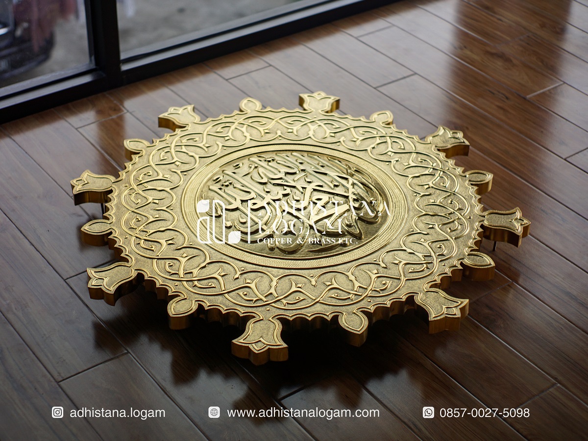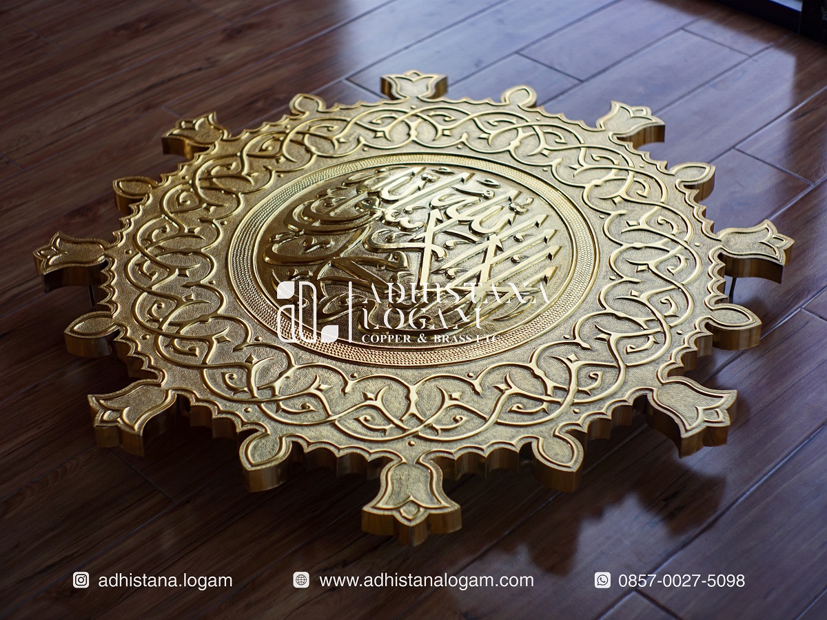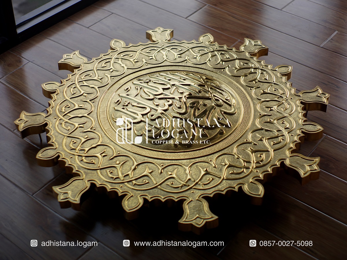 Terbuat dari bahan kuningan dengan warna asli menyerupai emas, ornamen ini memberikan kesan mewah di dalam masjid. jika diperhatikan secara detail motif nya merupakan ukiran timbul dengan bagian tengah kaligrafi dan bagian pinggir pattern islami yang diukir manual oleh tenaga ahli kami, setelah itu penambahan lis ketebalan samping sehingga menjadi kesan tebal atau istilahnya 3 dimensi, step yang terakhir finishing dengan cara dipoles sehingga menghasilkan warna emas mengkilat yang sangat mewah dan agar warna tetap awet maka produk ini dispray coating menggunakan coating yang setara untuk mobil sehingga tahan terhadap cuaca dan tidak mudah oksidasi. Ornamen ini cocok dipasang di pilar maupun sebagai hiasan dinding mushola atau masjid untuk memberikan sentuhan masjid ala Timur Tengah.